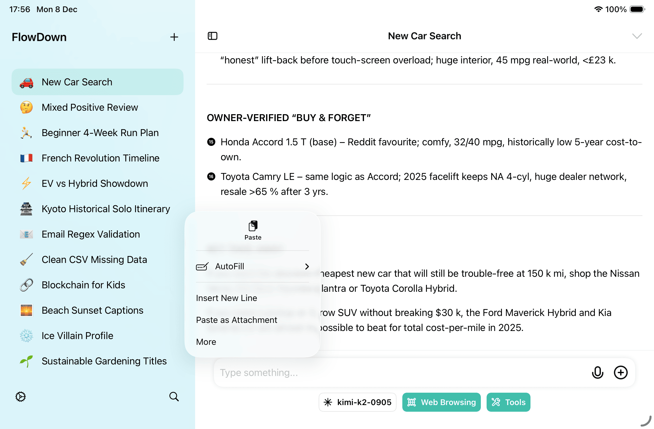 Attachments let you add documents, screenshots, audio clips, and notes to a conversation. FlowDown processes each file on-device and sends structured context to the model together with your prompt.