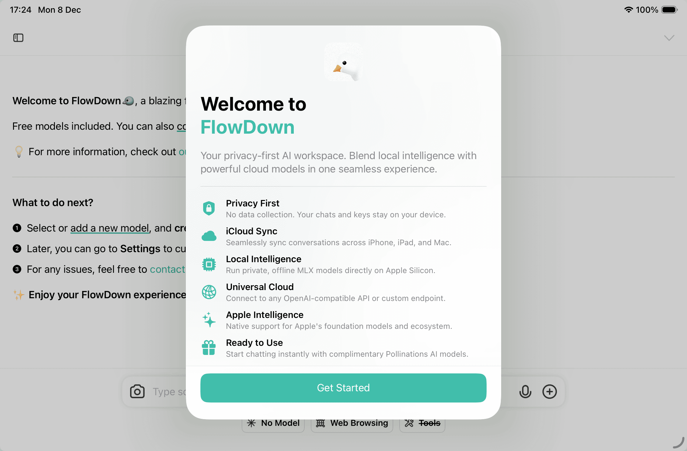 FlowDown aims to balance a lightweight interface with powerful model capabilities. Whether you need everyday Q&A or want to explore advanced features of new models, you can switch freely among on-device MLX, Pollinations, Apple Intelligence, and self-hosted endpoints.